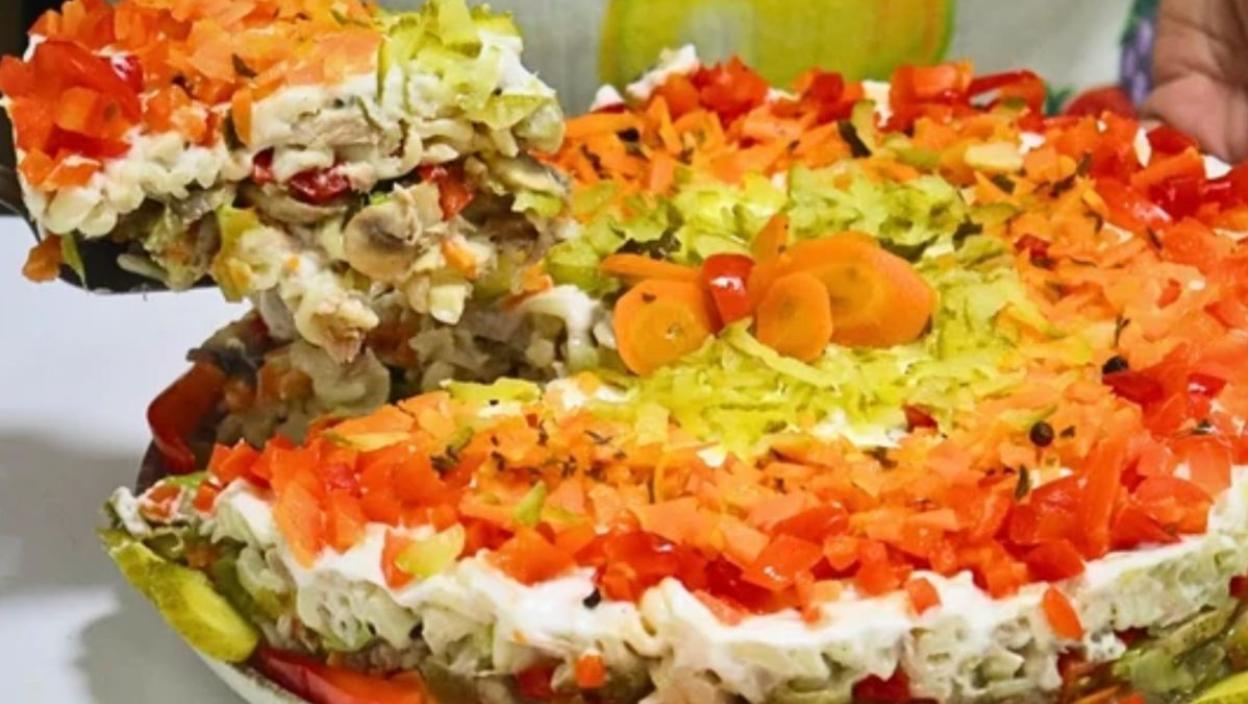 Propržite praziluk i šampinjone na malo ulja i dodajte začine. Iseckajte paprike, krastavčiće i šargarepu. U veliku činiju sipajte prohlađene makarone, pa dodajte tunjevinu, krastavčiće i majonez, i sve lepo sjedinite.