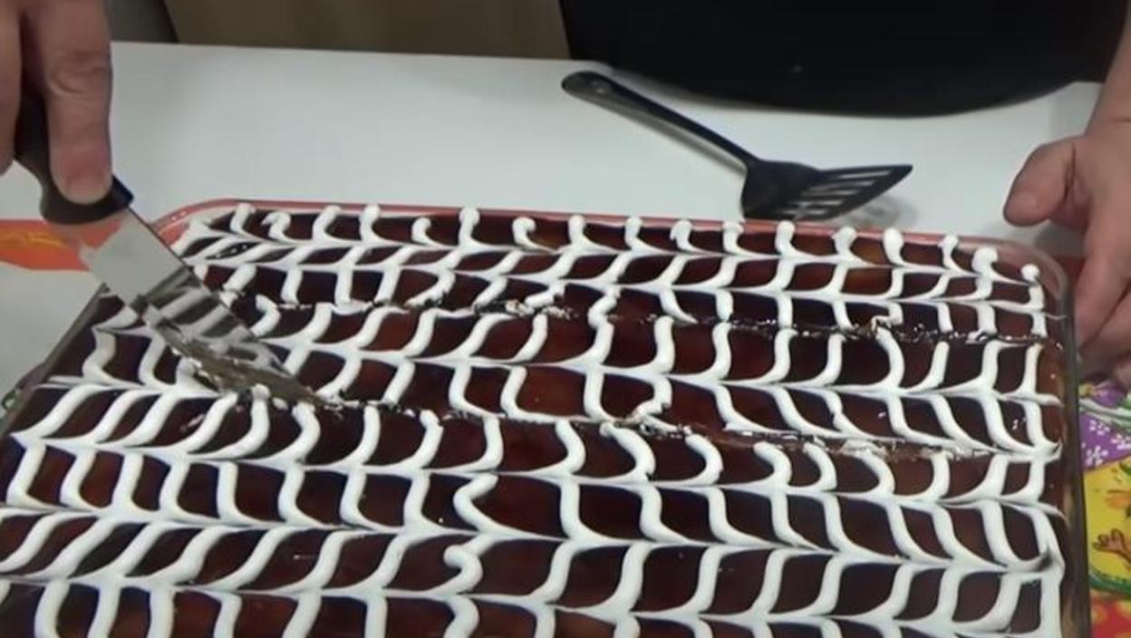 Od ovog tečno dela polovinu sipajte u četvrtasti kalup, zatim preko položite biskvitni deo. Potom ga izbušite debljom čačakalicom (ili drvcetom za ražnjiće) i prelijte ostatkom mešavine.