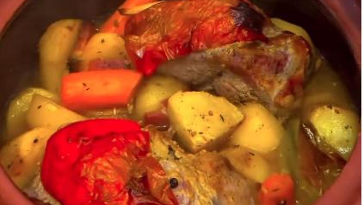 Sutradan oljuštite i isecite na krupnije komade omiljeno povrće po izboru, najbolje krompir i šargarepa, ali možete ekspermentisati. Zemljanu posudu debelo premažite mašću, dno i zidove, stavite na dno prvo meso, a zatim dodajte povrće seckano, slaninicu i dve kockice putera, poklopite. Stavite sve u hladnu rernu, a zatim podesite temperaturu na 200 stepeni i tri sata pecite, bez otvaranja rerne, nije potrebno da bilo šta radite, samo ostavite šporet da obavi ceo proces.