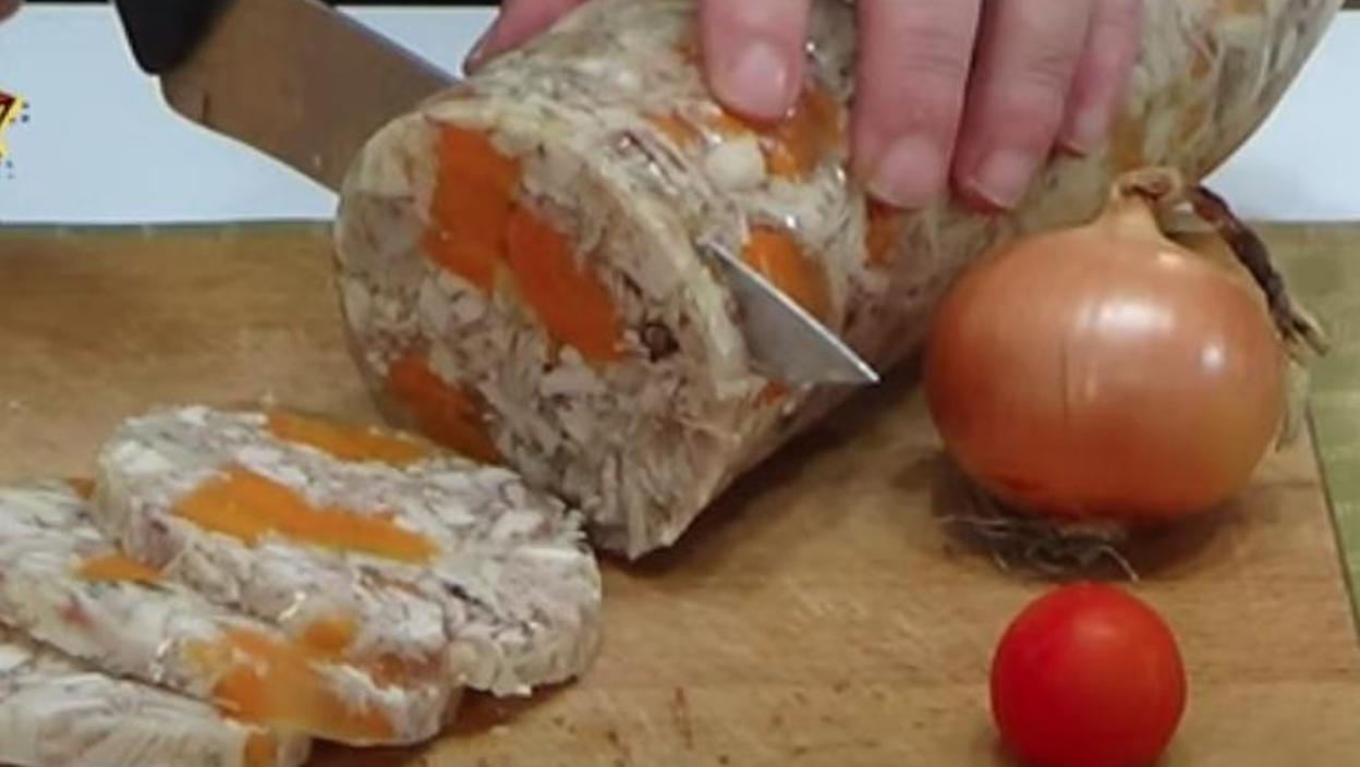 Pomešajte meso i šargarepu i začinite ga sa kašičicom soli i malo bibera. Uzmite jednu plastičnu flašu kojoj ste odrezali vrh. U flašu sipajte smesu od mesa i šargarepe i prelijte je bujonom u kojem ste razmutili želatin.