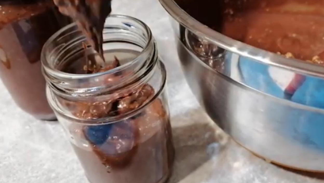 U posudu pomešate med i kakao i dobro promešajte dok se smesa ne sjedini. Zatim dodajte lešnik i nastavite sa mešanjem, a na kraju dodajte orahe i nastavite sa mešanjem.